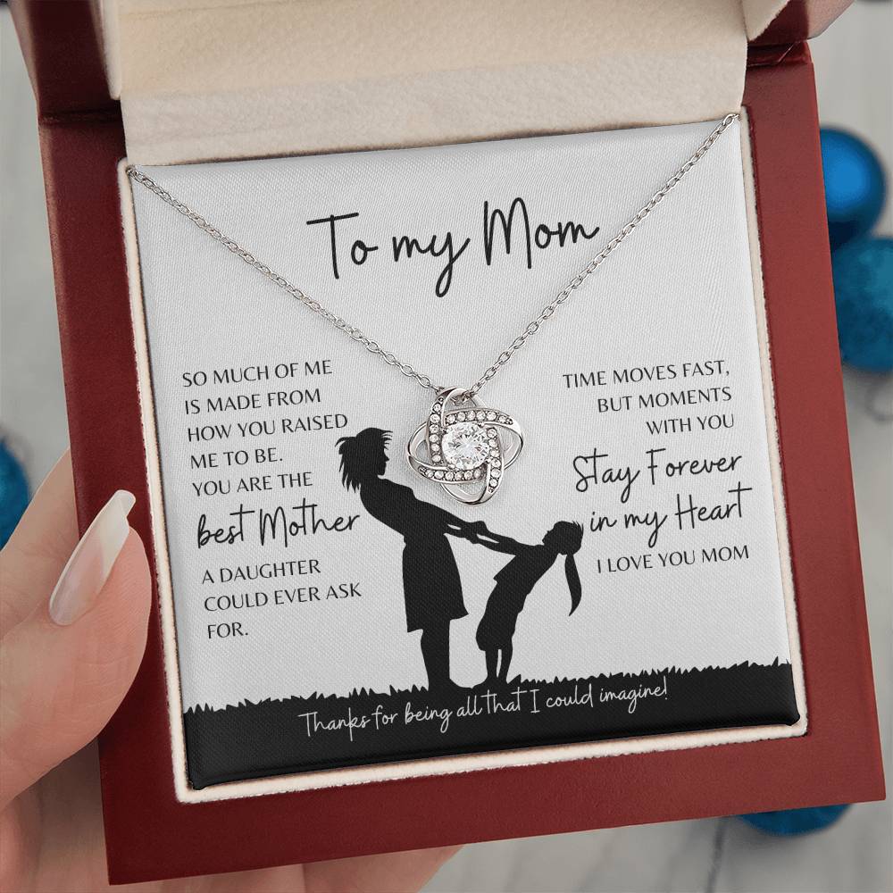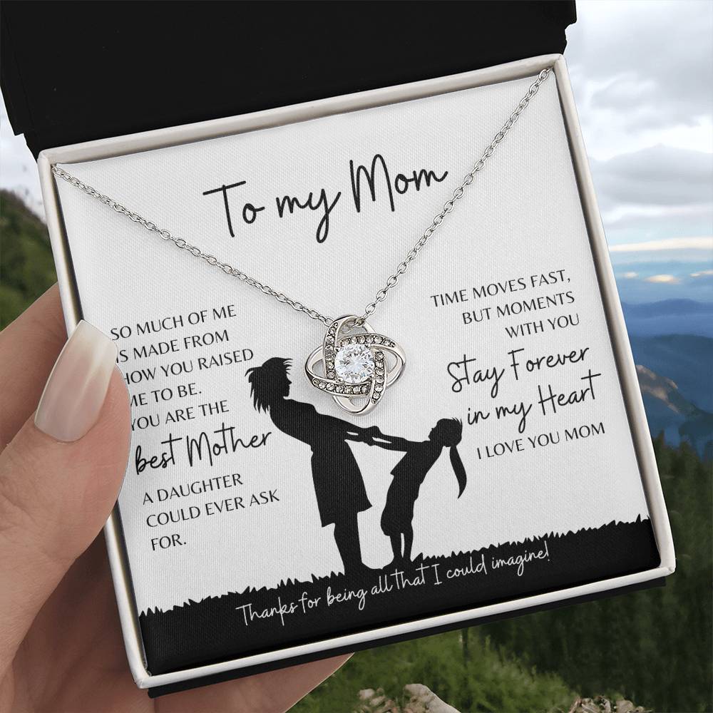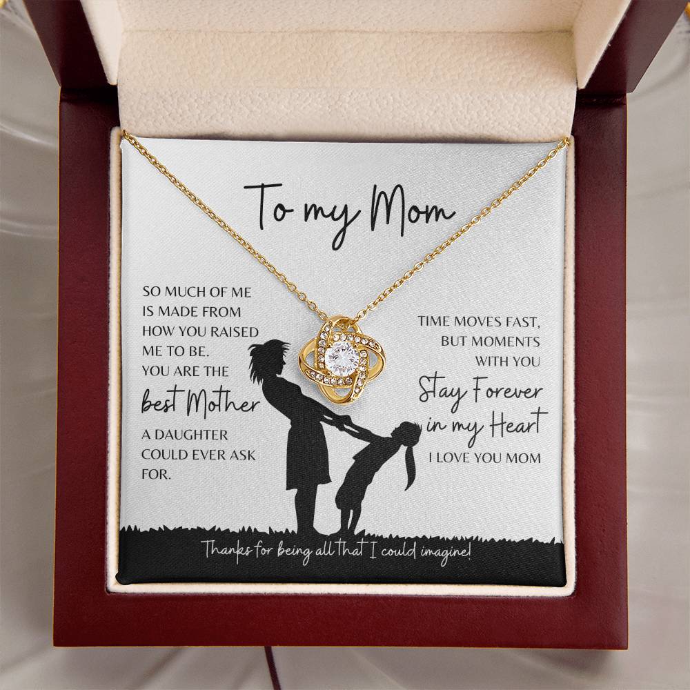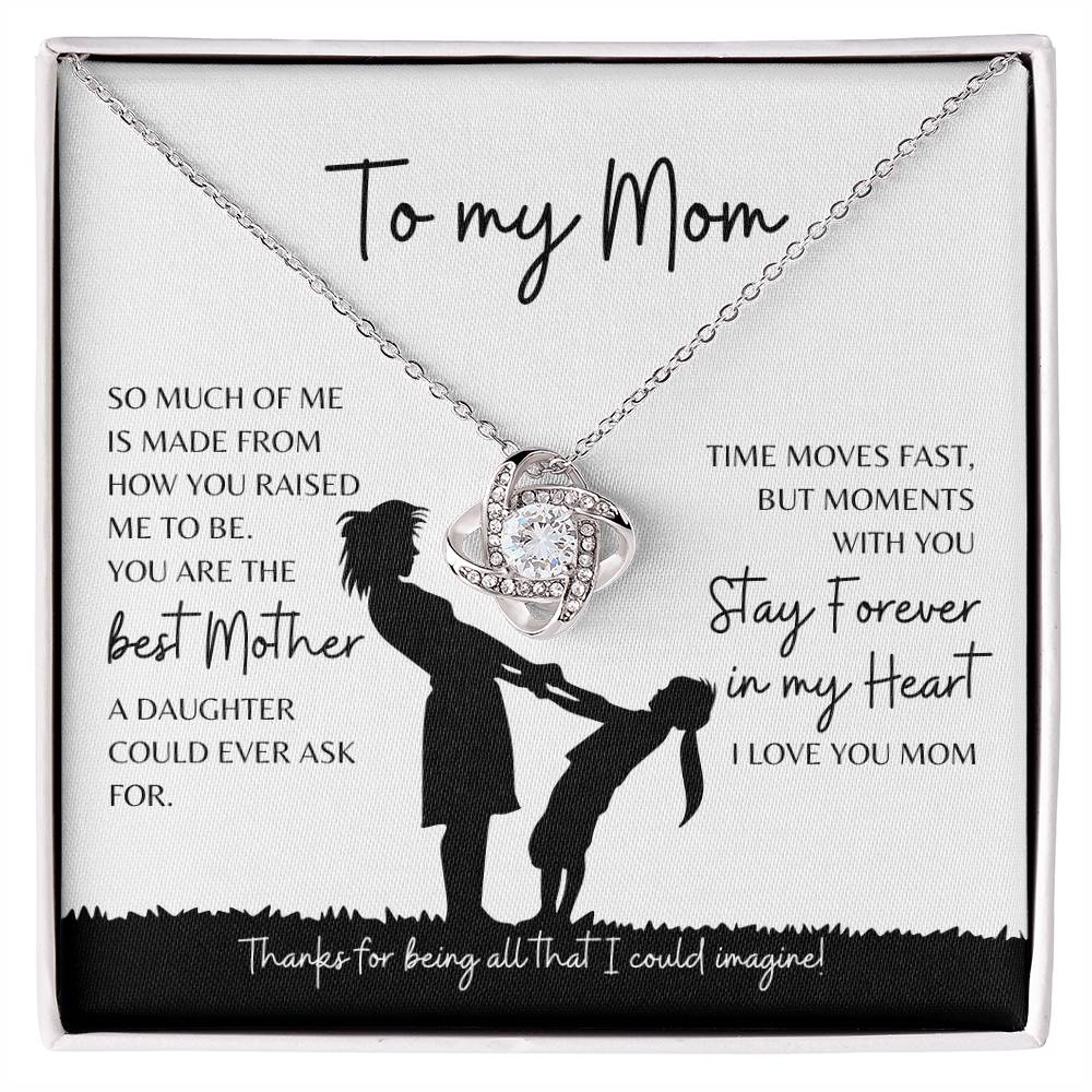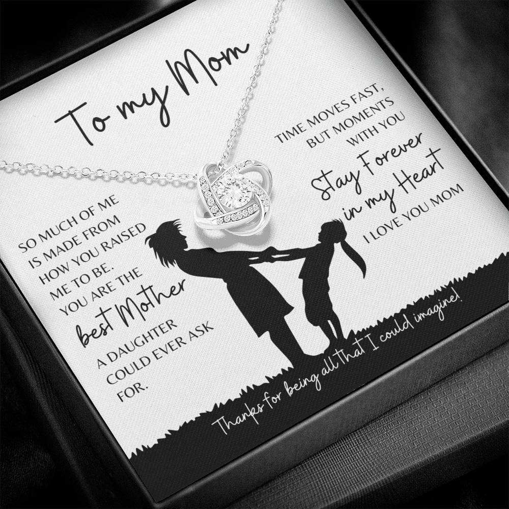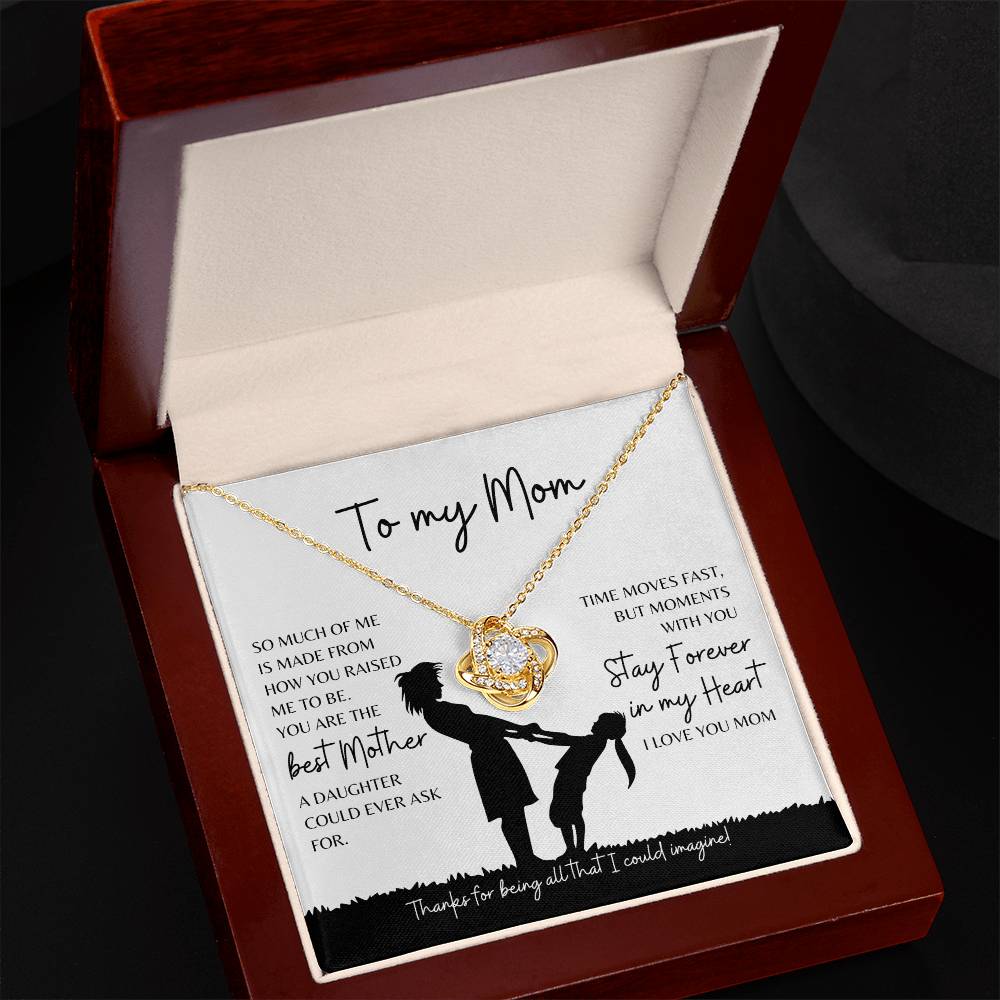 Imagine her reaction receiving this beautiful Love Knot Necklace. Depticting a memorable moment between a mom and daughter. The love knot represents an unbreakable bond between two souls, like shown in this playful silhouette of a mother and daughter. This message goes beyond words as it highlights a beautiful pendant embellished with premium cubic zirconia crystals. Surprise your Mom with this gorgeous gift today!