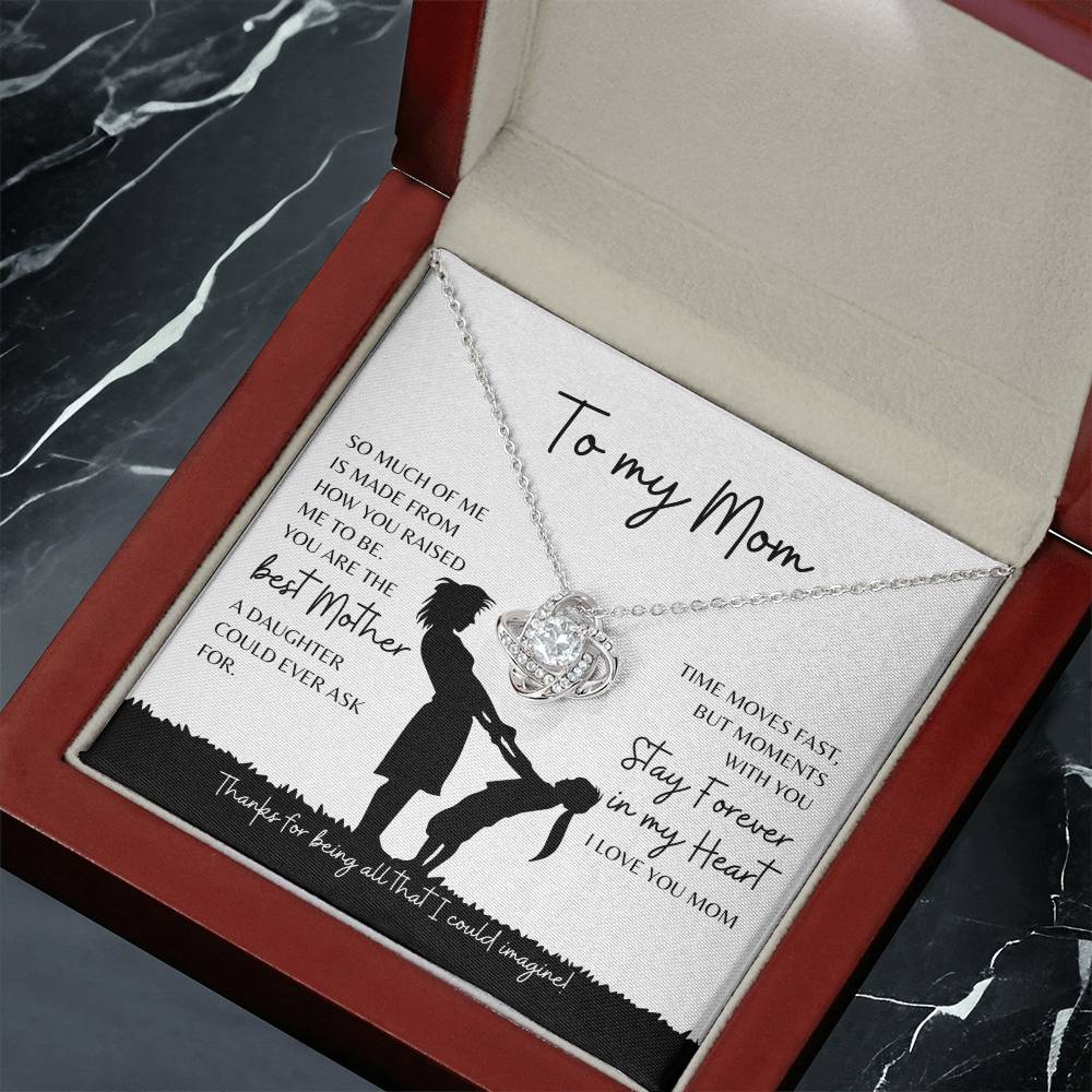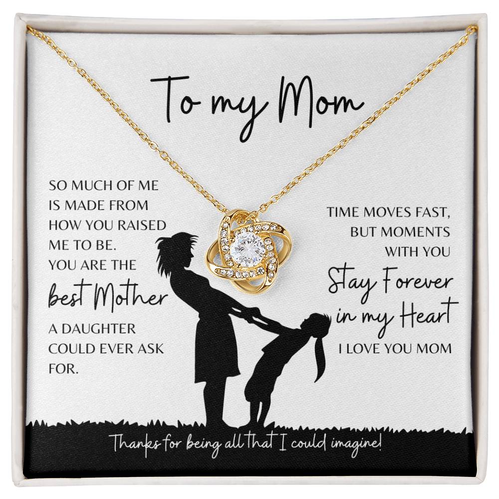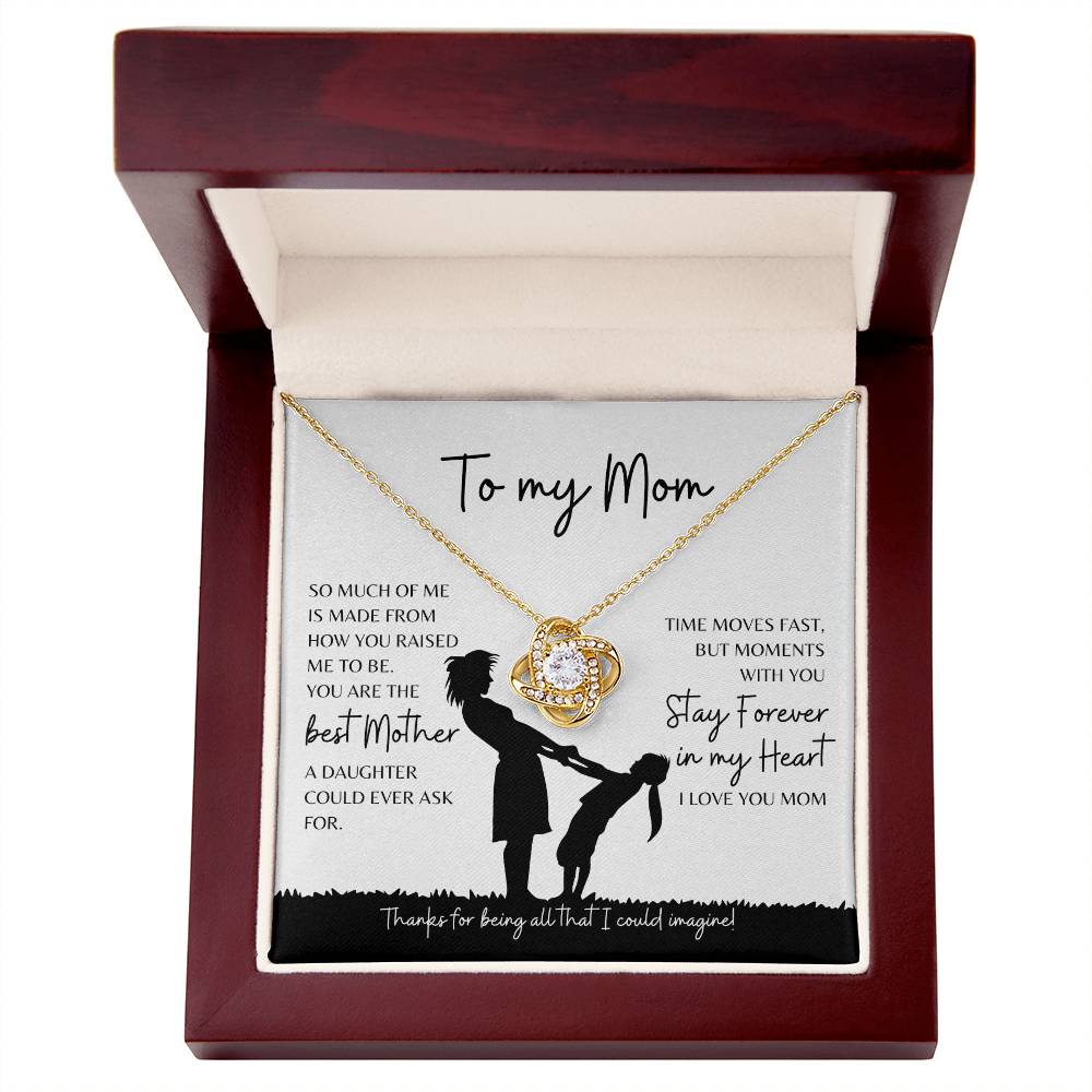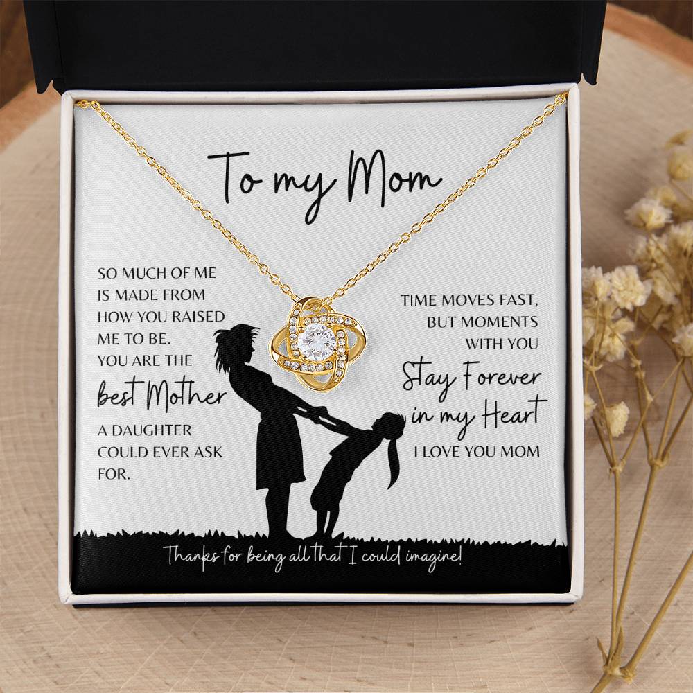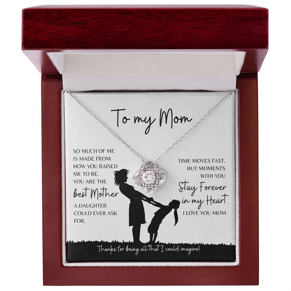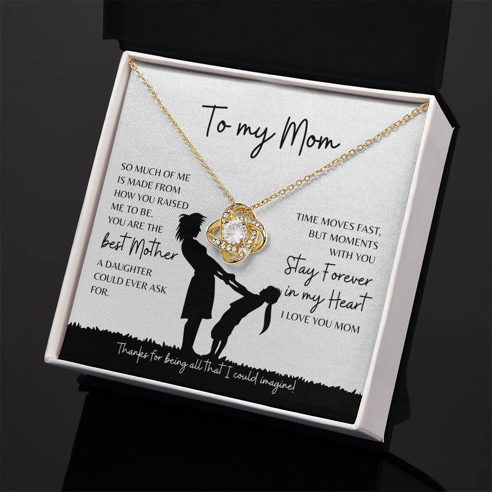 Imagine her reaction receiving this beautiful Love Knot Necklace. Depticting a memorable moment between a mom and daughter. The love knot represents an unbreakable bond between two souls, like shown in this playful silhouette of a mother and daughter. This message goes beyond words as it highlights a beautiful pendant embellished with premium cubic zirconia crystals. Surprise your Mom with this gorgeous gift today!