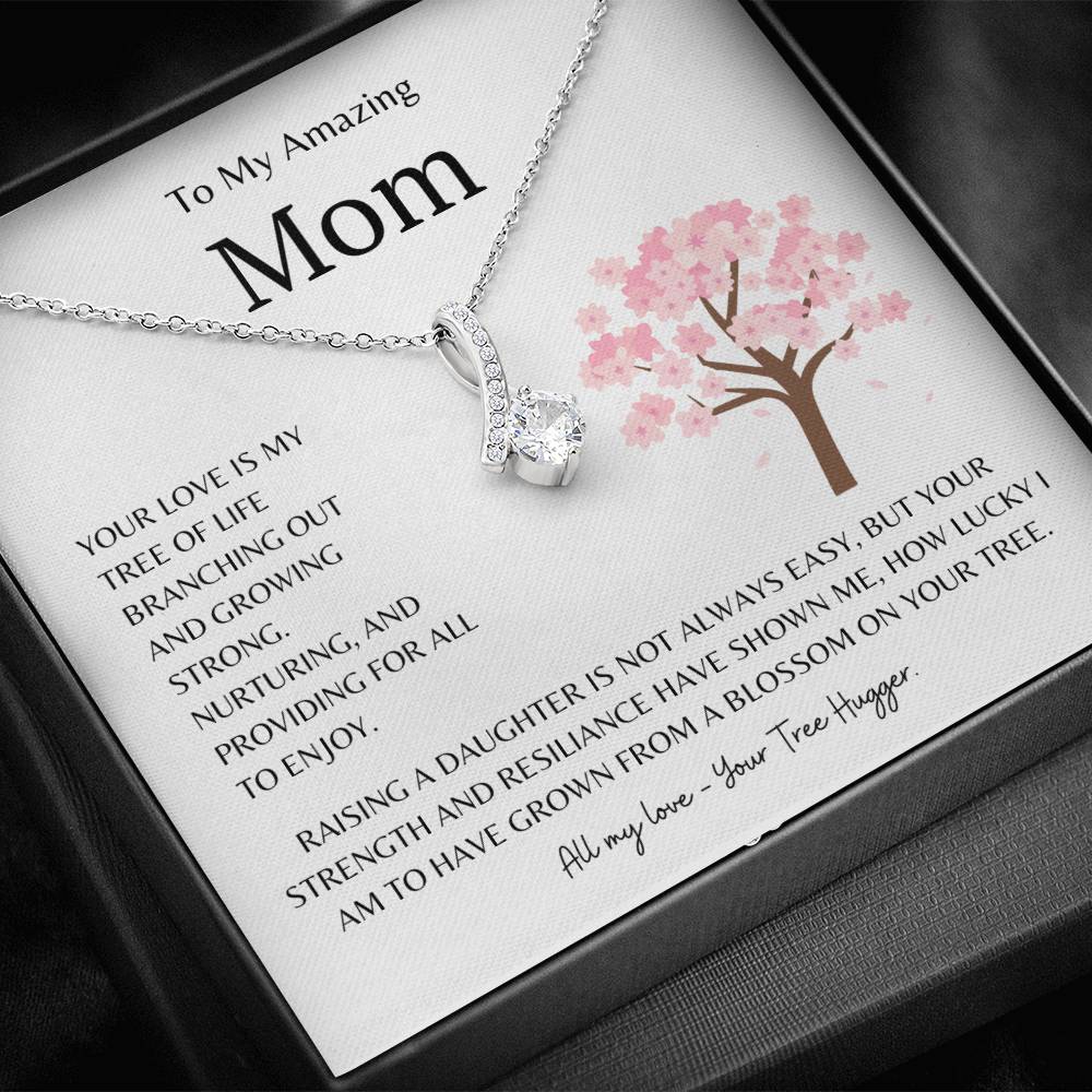 Take a moment to imagine your mom's reaction when she opens this stunning gift! Our Alluring Beauty message card necklace for moms features a petite ribbon shaped pendant that is sure to dazzle any mother. Whether it's for this Mother's day, a birthday or anniversary, make sure to get her a gift she will love for years to come.